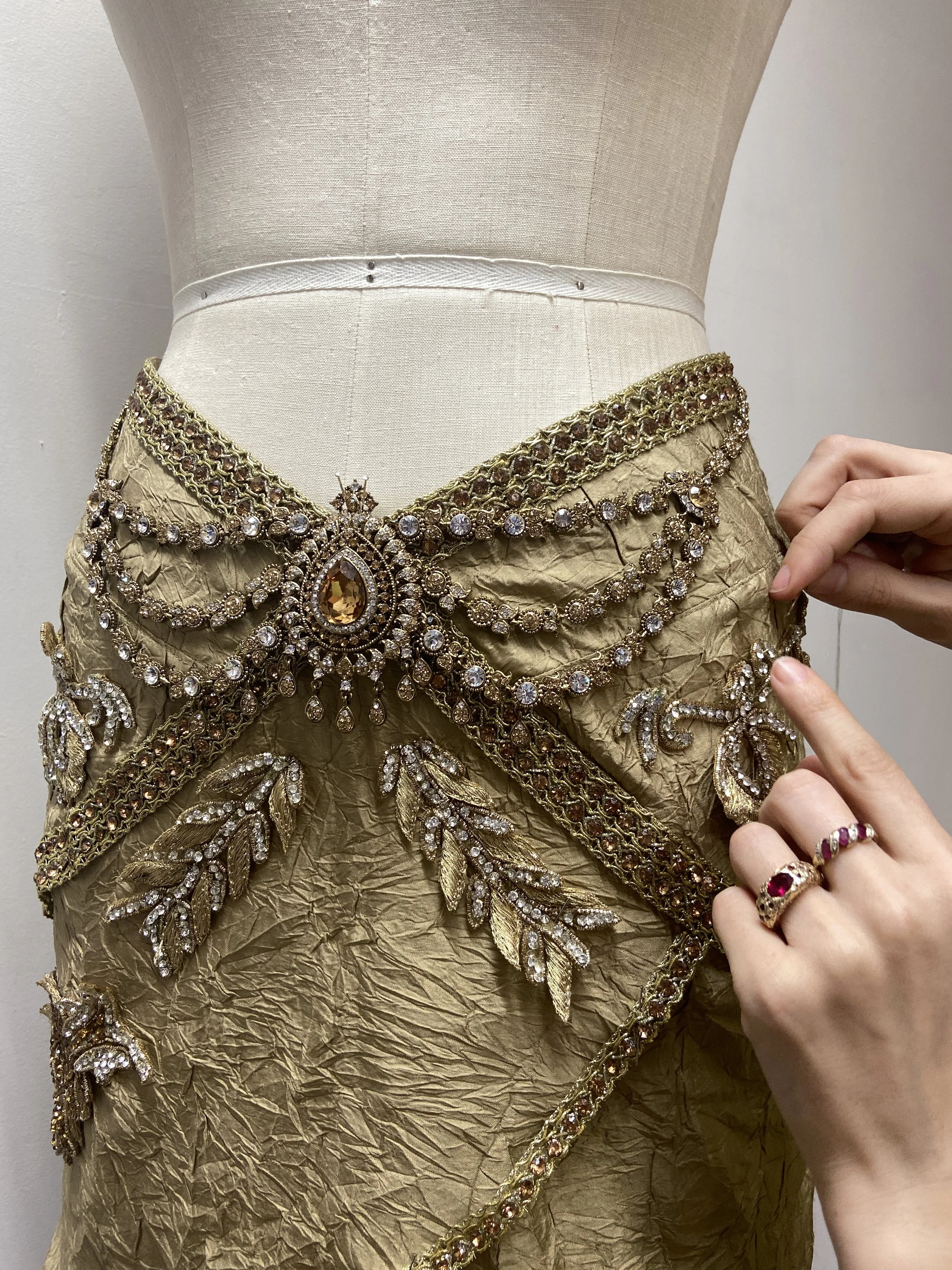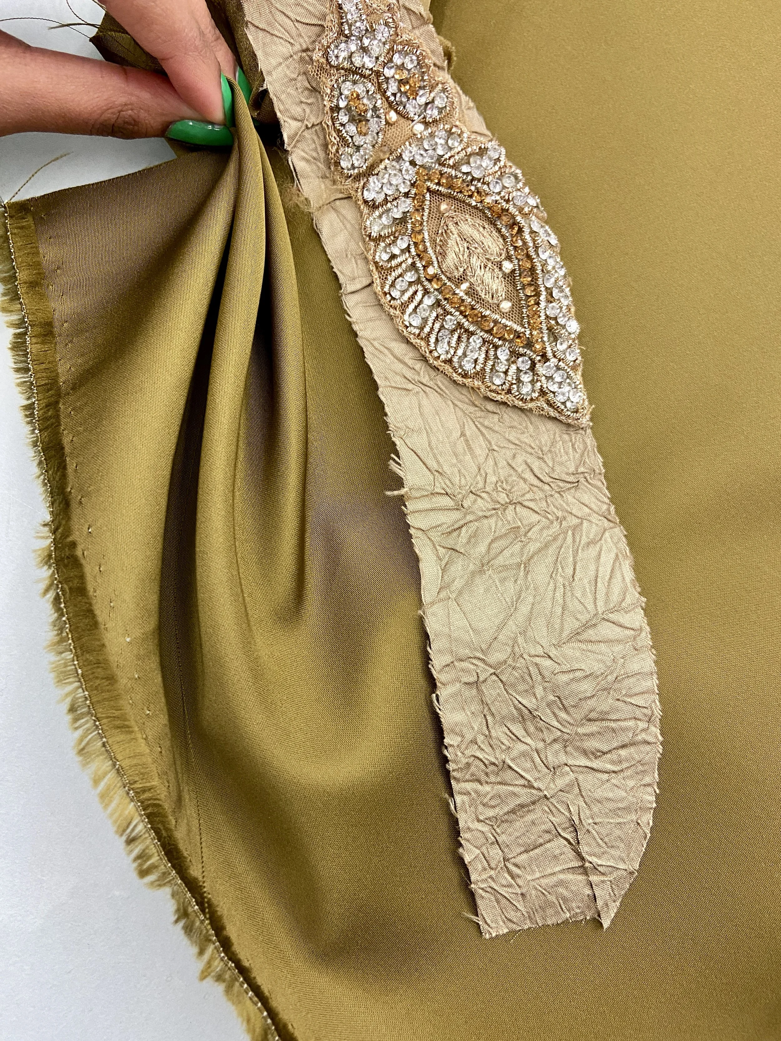 Custom Gown & cape designed and made for Joy Crooks in Collaboration with Natalie Roar. Referencing Joy’s heritage, this look was adorned with up-cycled sari embellishments and embellished with Swarovski hot fix stones. The cape edged with hand-stitched crystal embroidery tape.